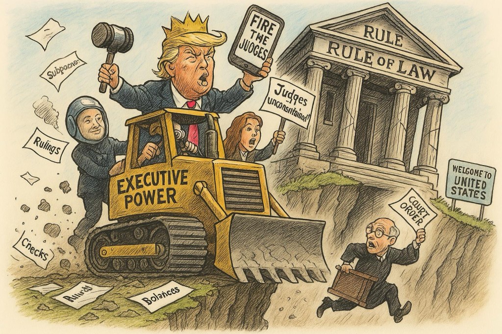 We are living through a slow-motion demolition of the American government. In this round; it’s the judiciary, and the crew behind the wrecking ball has gold-plated nameplates, social media cults, and a bottomless appetite for impunity. They’re not just ignoring the courts—they’re attacking them. With bulldozers. With bullhorns. With steak knives and ketchup-stained napkins.